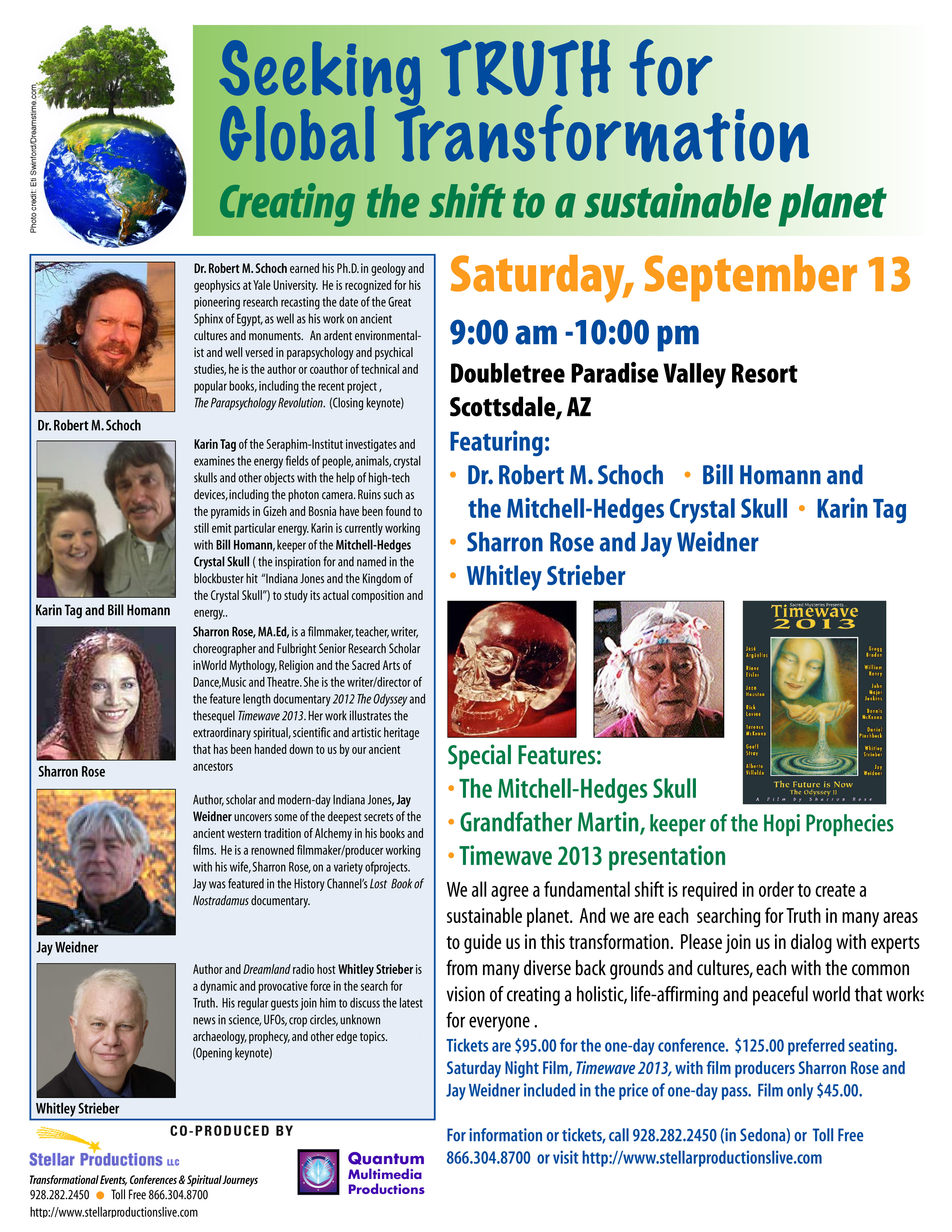 Sharron Rose - Through the vehicle of her two films on the subject of 2012 and the shift of the ages, as well as her numerous years of research and experience in the mythic and symbolic teachings of ancient traditions, author and filmmaker Sharron Rose brings a unique perspective to the serious issues that face us in today’s world. Having represented the United States as a Fulbright Senior Research Scholar, been a consultant to the National Endowment for the Arts as well as through lectures and performances in schools, universities and museums worldwide, she has become very focused upon the dreams and visions that the Founding Fathers had for America, dreams that are being lost today. At this crucial moment in time she feels that her task is to inspire individuals to free themselves from fear, look deep within and come together in community dialogue to envision and co-create a world of beauty, grace and sustainability. |